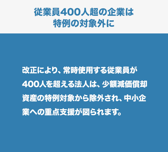 改正により、常時使用する従業員が400人を超える法人は、少額減価償却資産の特例対象から除外され、中小企業への重点支援が図られます。