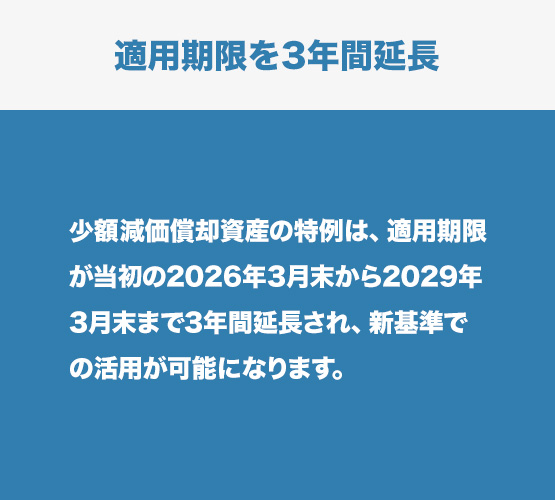 少額減価償却資産の特例は、適用期限が当初の2026年3月末から2029年3月末まで3年間延長され、新基準での活用が可能になります。
