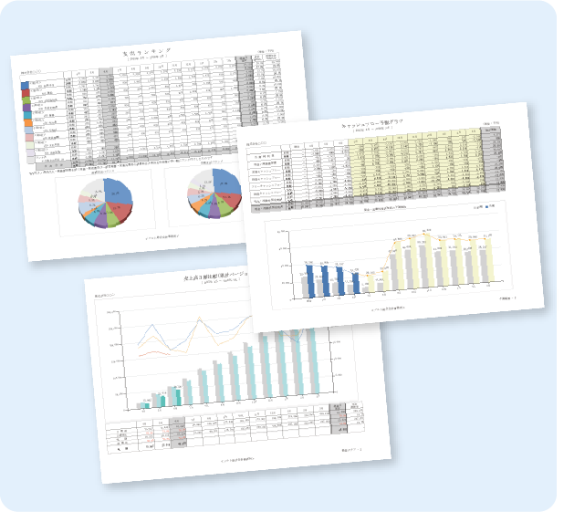 月次レポートでは多方面から数字を分析し、検証した結果を視覚的に分かりやすくすることで経営改善へ近づけます。